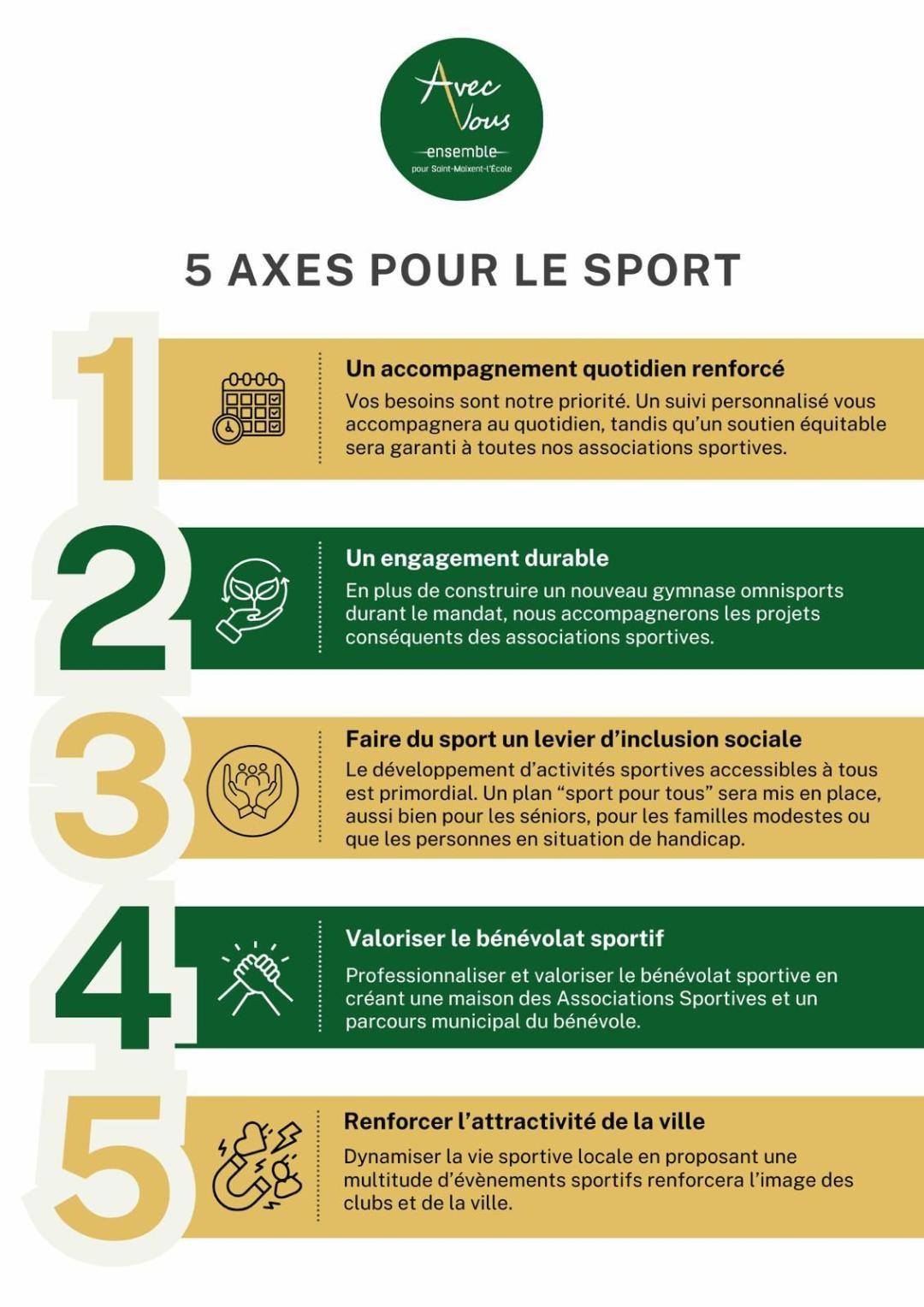 A l'occasion d'un Rendez-vous Avec Vous qui réunissait des associations représentant près de 1200 licenciés, l'équipe des sports de la liste AvecVous, ensemble, pour Saint-Maixent-l'École a dévoilé ses 5 axes prioritaires qui guideront notre future politique sportive.
